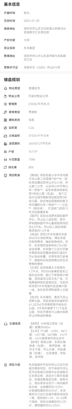 東關集團所開發的坪山江邊片區城市更新項目,位于深圳市坪山區馬巒街道江嶺路與比亞迪路交匯處西北側,項目分三期開發建設,擬建成集商品住房、商務辦公、商業等多業態于一體的城市綜合體,占地面積約12萬㎡,計容建筑面積約53萬㎡。東關珺府為江邊片區城市更新項目的一期,規劃有01-01、01-02兩個地塊,項目占地面積約3.2萬㎡,建筑面積約24.3萬㎡。